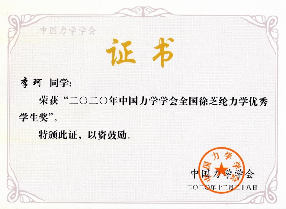 支部成员荣获“2020年中国力学学会全国徐芝纶力学优秀学生奖”