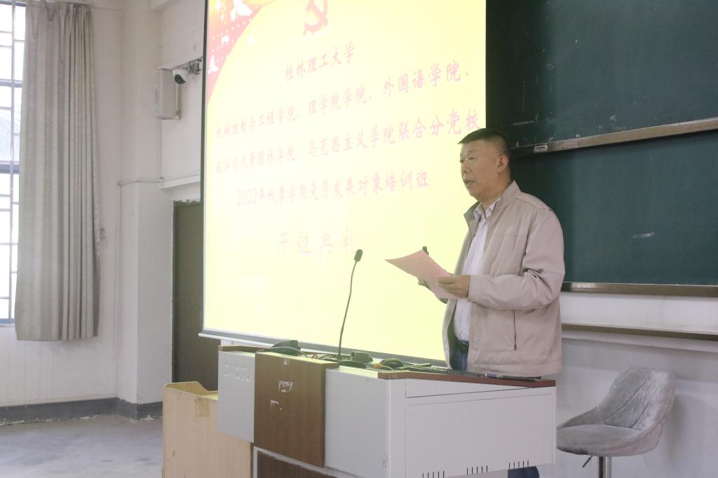 为深入学习贯彻习近平新时代中国特色社会主义思想和党的二十大精神,切实提高党员发展质量,11月10日中午,机械控制与工程学院、理学院、外国语学院、旅游与风景园林学院、马克思主义学院2022年秋季学期联合分党校发展对象培训班开班典礼在雁山校区06105教室举行。机械控制与工程学院党委书记李治出席开班典礼。开班典礼由培训班班主任、机械控制与工程学院组织员韩波主持。来自机械控制与工程学院、理学院、外国语学院、旅游与风景园林学院、马克思主义学院共165名培训班学员参加了本次典礼。