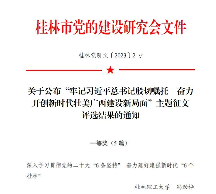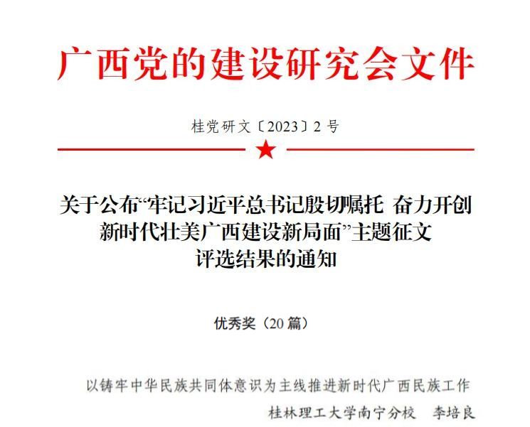 近期,全区“牢记习近平总书记殷切嘱托 奋力开创新时代壮美广西建设新局面”主题征文评审结果揭晓,我校选送的两篇参赛文章均荣获奖项。其中,党办冯劲桦同志参赛文章《深入学习贯彻党的二十大“6条坚持” 奋力建好建强新时代“6个桂林”》荣获桂林市一等奖,南宁分校组织部李培良同志参赛文章《以铸牢中华民族共同体意识为主线推进新时代广西民族工作》荣获全区优秀奖。