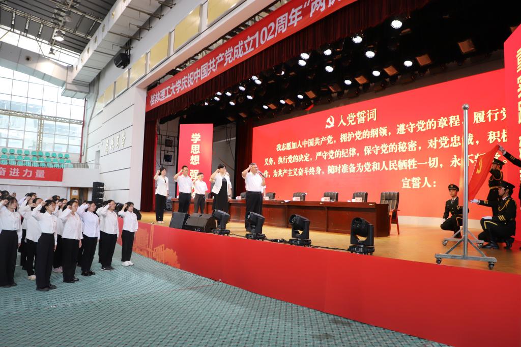 邓军在讲话中深情回顾了中国共产党102年来的峥嵘岁月和光辉历程,强调特别是新时代10年来,以习近平同志为核心的党中央以非凡的政治勇气、丰富的政治智慧、高超的政治能力、强烈的责任担当,举旗定向、谋篇布局,团结带领全党全军全国各族人民,采取一系列战略性举措,推进一系列变革性实践,实现一系列突破性进展,取得了一系列标志性成果,引领党和国家事业取得历史性成就、发生历史性变革。他指出,学校建校67年来,始终与党和国家共命运,与人民同呼吸,与时代同进步,牢记立德树人根本任务,在为党育人、为国育才的长期坚守中为党和国家的教育事业作出了桂工人突出的贡献。