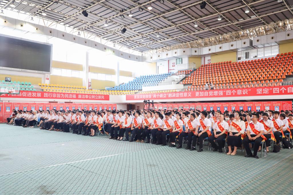 在全党上下深入开展学习贯彻习近平新时代中国特色社会主义思想主题教育、奋力开创党和国家事业高质量发展新局面之际,为热烈庆祝中国共产党成立102周年,表彰2021-2023年度在学校建设发展中涌现出来的优秀共产党员、优秀党务工作者和先进基层党组织,重温党的光辉历程和丰功伟绩,弘扬党的优良传统作风,抒发对党的无限忠诚与热爱,6月30日上午,我校在屏风校区体育馆三楼举行庆祝中国共产党成立102周年“两优一先”表彰大会。在家党员校领导邓军、吴志强、王玫、韦学敏、曾繁荣出席会议。党委常委唐壮东、叶昊、邱杰,校长助理罗盛锋、潘旦光,党委职能部门主要负责人、各二级党委书记、全体中层干部、全体受表彰党员和基层党组织负责人、全体党支部书记、新党员代表、离退休党员代表以及民主党派代表约430人参加会议。大会由学校党委副书记吴志强主持。