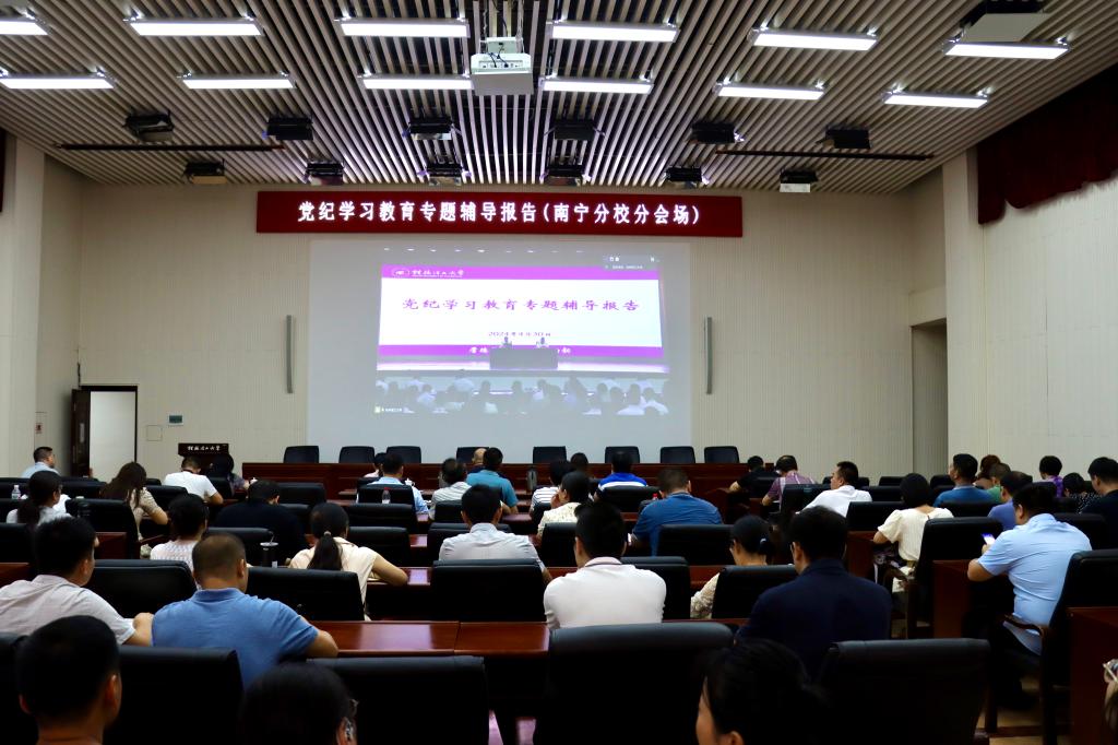 为深入学习贯彻习近平总书记关于党纪学习教育的重要讲话和重要指示精神,准确把握习近平总书记关于党的自我革命的重要思想的精髓要义、实践要求,推动学校党纪学习教育走深走实,4月30日上午,自治区党委党校副校长,广西行政学院副院长、校务委员谭泽松应邀到我校作题为《学习贯彻习近平总书记关于党的自我革命的重要思想》专题辅导报告。学校党委书记邓军主持报告会。在家党员校领导王敦球、王磊、黎贞崇、罗盛锋、曾繁荣,党委常委唐壮东、叶昊、邱杰,党委委员、校长助理张成龙出席报告会。全体处级党员领导干部、学校党纪学习教育工作专班以及机关党委全体党员约380人参加报告会。