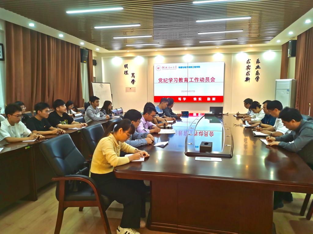 4月17日,物理与电子信息工程学院党委召开党纪学习教育工作动员会,认真学习习近平总书记关于党纪学习教育的重要讲话和重要指示精神,传达学习学校党纪学习教育工作部署会会议精神,研究讨论《物理与电子信息工程学院党纪学习教育实施方案》,部署学院党纪学习教育工作。同日,学院党委党纪学习教育专题读书班开班并举行第一次集中学习。学院党委书记领学了习近平总书记关于党的纪律建设的重要讲话、重要指示精神及新修订的《中国共产党纪律处分条例》,就学院党纪学习教育读书班计划安排进行说明。各党支部结合实际,迅速开展活动,原原本本、逐字逐句研学《条例》,认真学习《中国共产党廉洁自律准则》等,力求务实有效。
