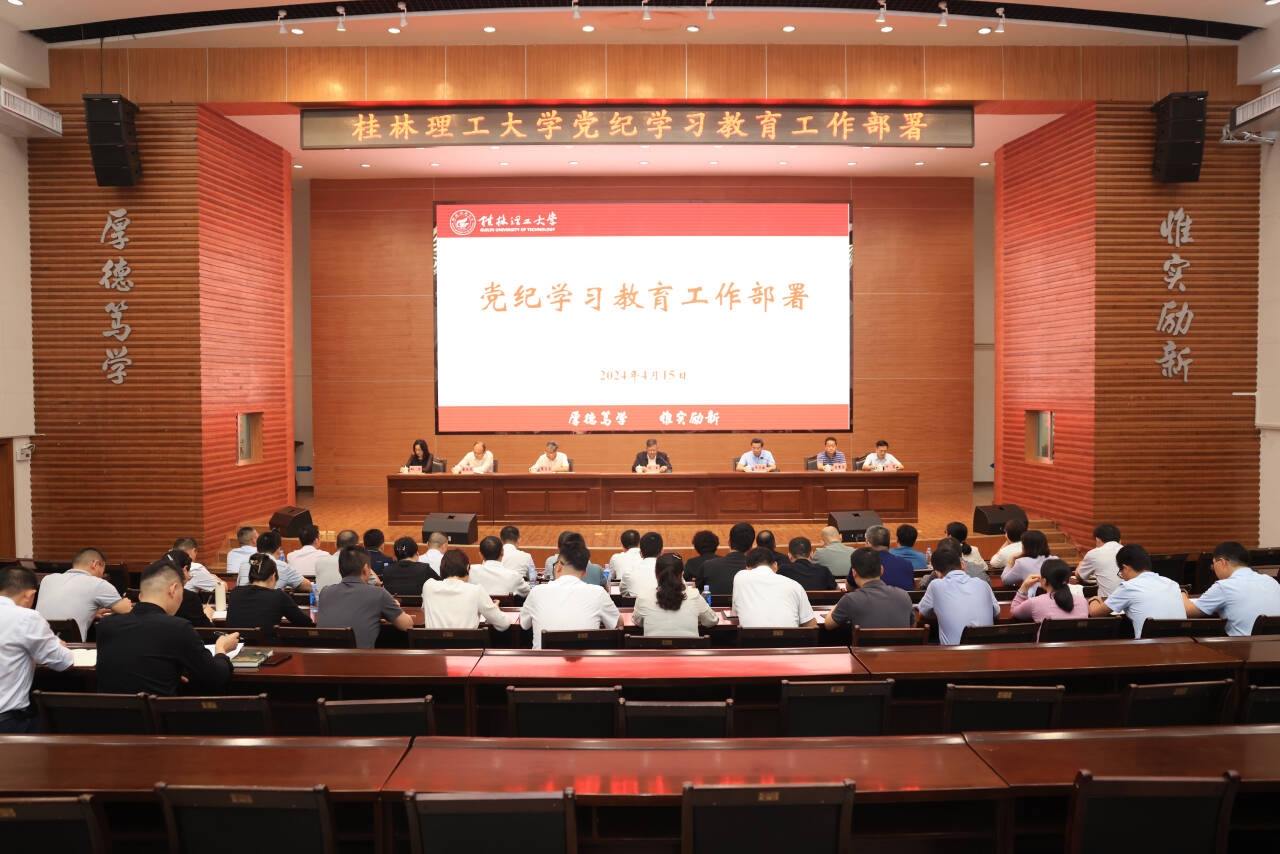 4月15日,学校在屏风校区图书馆报告厅召开党纪学习教育工作部署会议,深入学习贯彻习近平总书记关于开展党纪学习教育的重要讲话和重要指示精神,贯彻落实中央党的建设工作领导小组会议以及自治区党委部署要求,对学校开展党纪学习教育进行部署。学校党委书记邓军出席会议并作部署讲话。会议由自治区纪委监委驻学校纪检监察组组长,学校党委常委、纪委书记韦学敏主持,在家党员校领导黎贞崇、曾繁荣,党委常委唐壮东、叶昊、邱杰出席会议。