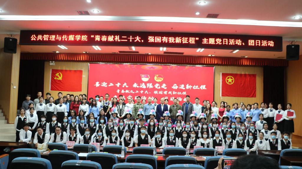 为进一步深入贯彻落实习近平总书记关于青年工作的重要思想,以迎接党的二十大为主线,结合庆祝建团100周年,形成党团共建争先创优好局面。公共管理与传媒学院于2022年5月16日晚在雁山校区图书馆报告厅举办了“喜迎二十大、永远跟党走、奋进新征程——青春献礼二十大,强国有我新征程”示范性党日活动、团日活动。学校党委常委、组织部部长唐壮东,学校团委书记李雨等领导出席活动,并对活动进行指导。