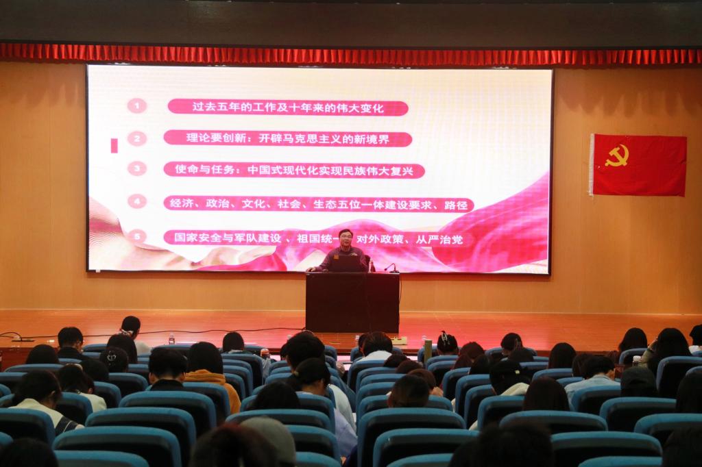 开班典礼结束后,由公共管理与传媒学院党委书记陆平老师为学员们讲授《认真学习党的二十大精神,建功全面现代化新征程》专题党课。陆平老师从党的二十大召开的背景及重要意义、二十大报告主要内容框架体系、二十大报告的新表述新概括新论断、学习二十大建功新征程等五个方面深刻阐述了党的二十大精神,主题鲜明,重点突出,内容丰富,分析透彻,既有理论高度,又有思想深度,帮助学员加深了关于党的二十大精神的理解,深化了对于学习党的二十大精神重要性的认识。