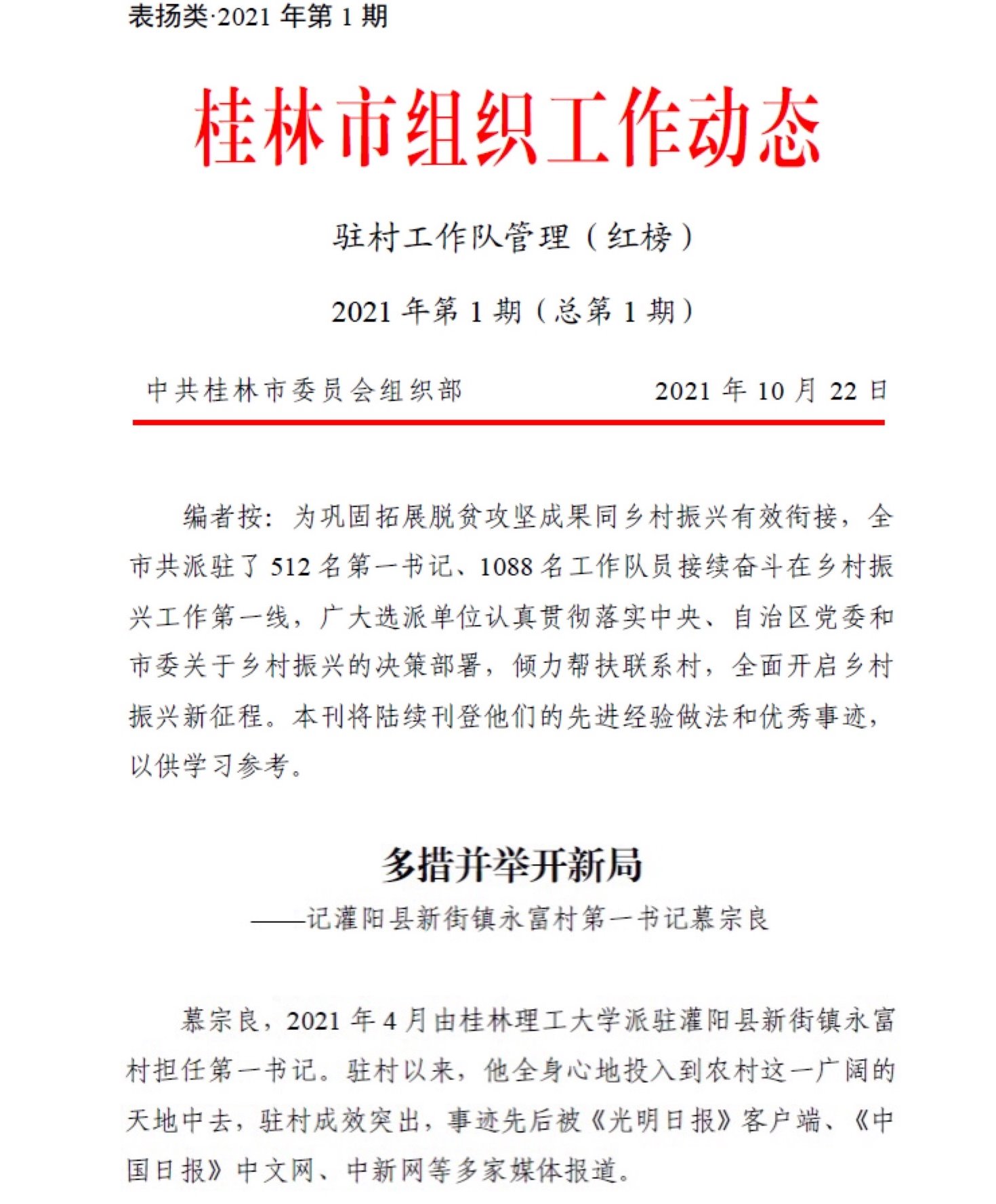 近日,桂林市委组织部发布《桂林市组织工作动态驻村工作队管理(红榜)》(表扬类·2021年第1期),我校派驻灌阳县新街镇永富村第一书记慕宗良的先进经验做法和优秀事迹光荣上榜。