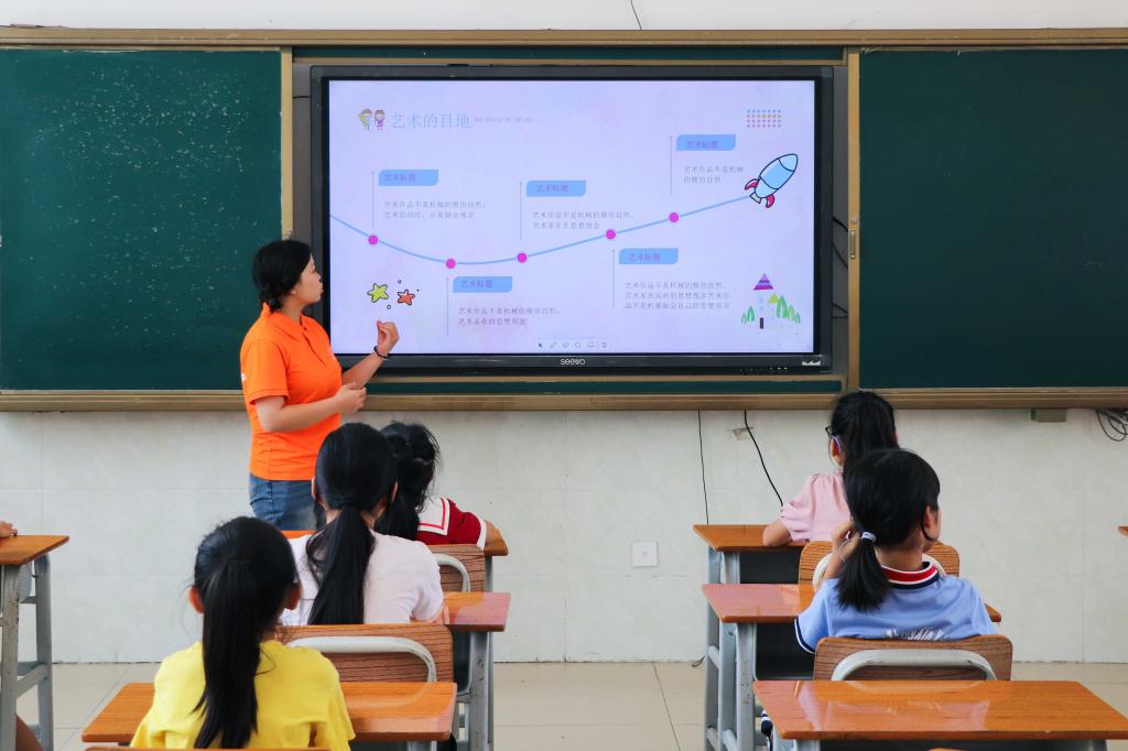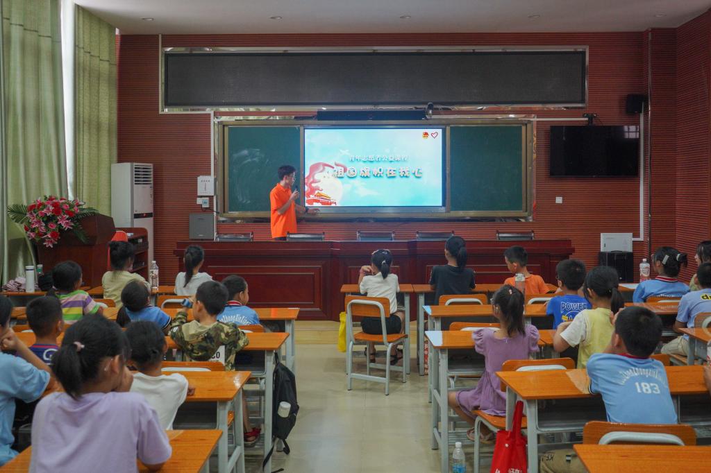 2023年7月,beats365亚洲版南宁分校“彩虹行动 成长筑梦”志愿服务队赴广西壮族自治区崇左市扶绥县渠黎镇开展集中志愿服务活动。志愿服务队结合大学生暑期“三下乡”社会实践活动,充分利用政、校、地资源,积极构建大学生与少年儿童“双融合、双促进”志愿服务体系。图为开展“热爱祖国”小课堂,加强小朋友爱国主义教育。